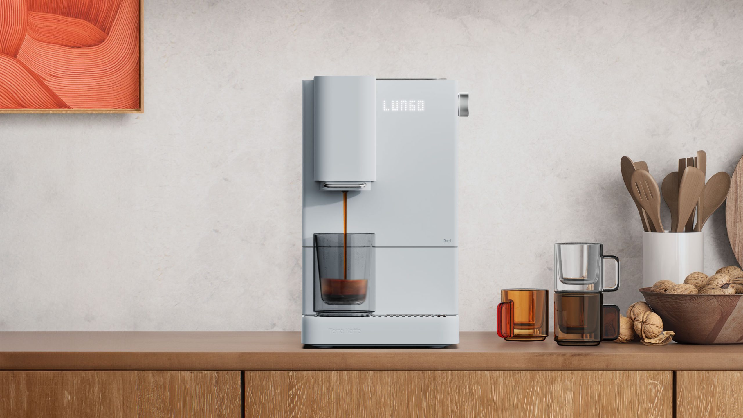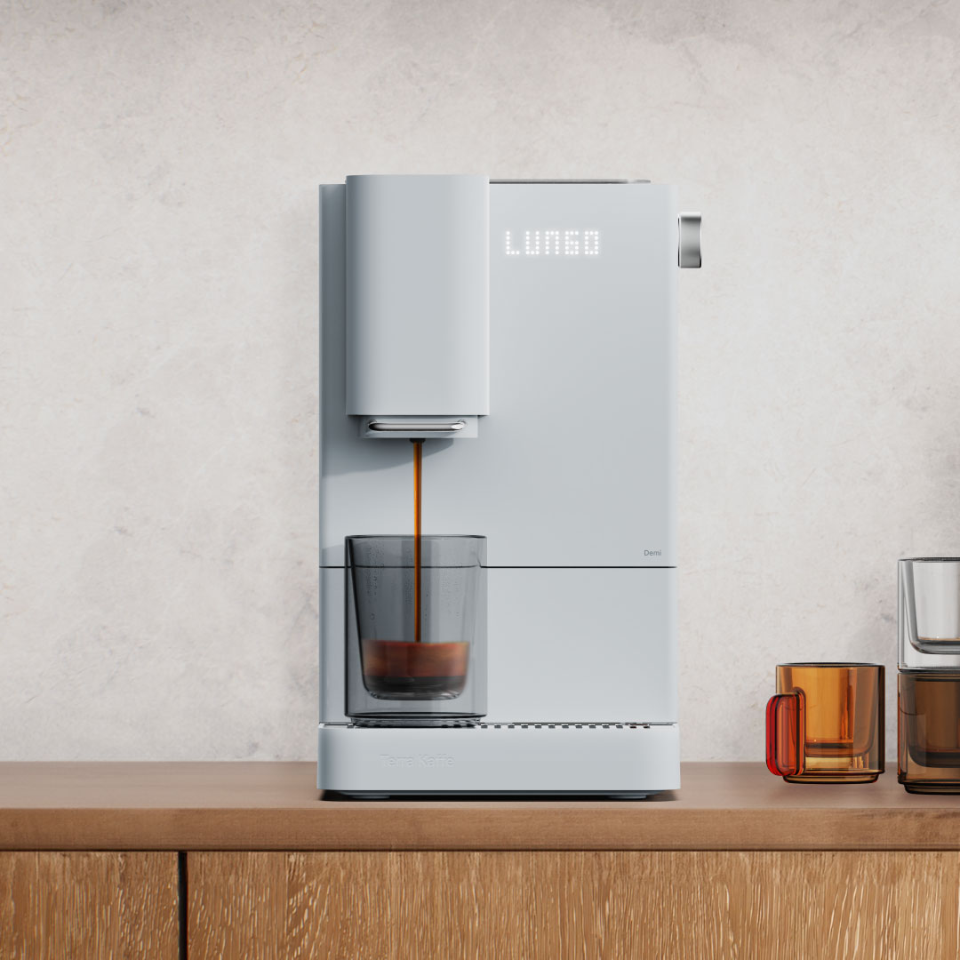 The user interface is deliberately minimal: a tactile brushed-metal selector dial and dot-matrix display reduce visual clutter, while giving users clear, intuitive control over core settings. Demi handles Americano, espresso, lungo, and drip coffee with ease; from single shots to milk-based drinks, the result is a refined and seamless experience that supports the daily rhythm of home brewing.